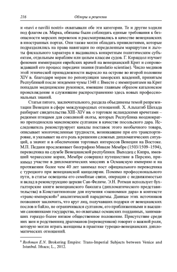 Рецензируемый сборник содержит материалы семинара, который состоялся в 2015 г. в Венеции и был организован в честь выдающегося историка Б. Арбеля. Представленные исследования посвящены истории Венецианской морской империи в период раннего Нового времени, причем особое внимание уделяется осмыслению природы этого государственного образования, повседневным практикам его существования и институциональной среде венецианских владений в Восточном Средиземноморье. 15 статей, написанных специалистами в данной области, охватывают широкий круг тем, включая репрезентацию власти, формы политической коммуникации, распространение новостей, правовой статус физических лиц и кораблей, социальные сети, культурные и религиозные идентичности, миграции, механизмы передачи знания и перемещение материальных объектов. Рецензент дает сборнику высокую оценку, отмечая глубину анализа исторических источников и поиск новых подходов к решению поставленных проблем