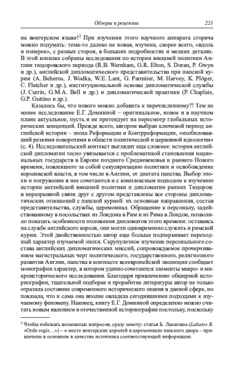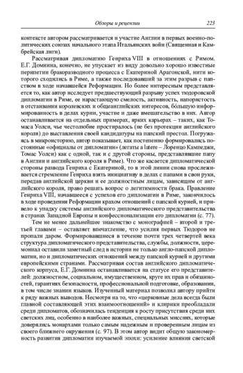 В рецензируемой монографии история дипломатических отношений между ранними Тюдорами (1485–1558) и римской курией изучается в контексте существенных изменений, происходивших во внутренней эволюции европейских национальных государств – в первую очередь, Англии – на рубеже позднего Средневековья и раннего Нового времени, укрепления в них светской власти в ущерб универсалистским притязаниям папства. Этот путь прослеживается автором книги во всей его сложности и противоречивости, учитывая двойственную природу папской власти. Автору удалось показать англо-папскую дипломатию включенной в сложные международные отношения эпохи: Итальянские войны, растущую турецкую угрозу, преодоление последствий Столетней войны и др. Автор подробно анализирует состав английских дипломатических миссий в Риме и, наоборот, их функции, особенности, связанные с тем, что эти дипломаты, находясь на службе английского короля, нередко становились и служителями римской курии
