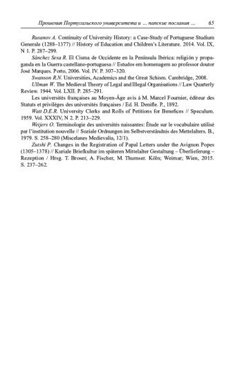 33. Rusanov A. Continuity of University History: a Case-Study of Portuguese Studium Generale (1288-1377) // History of Education and Children’s Literature. 2014. Vol. IX, N 1. P. 287-299. EDN: UEOVMX