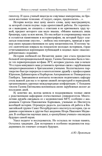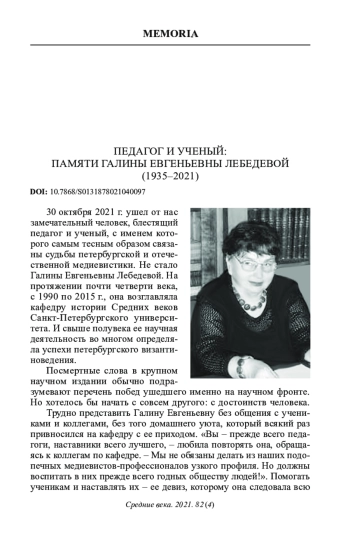 ПРОКОПЬЕВ А. Ю. ПЕДАГОГ И УЧЕНЫЙ: ПАМЯТИ ГАЛИНЫ ЕВГЕНЬЕВНЫ ЛЕБЕДЕВОЙ (1935-2021) // СРЕДНИЕ ВЕКА. 2021. Т. 82 № 4
