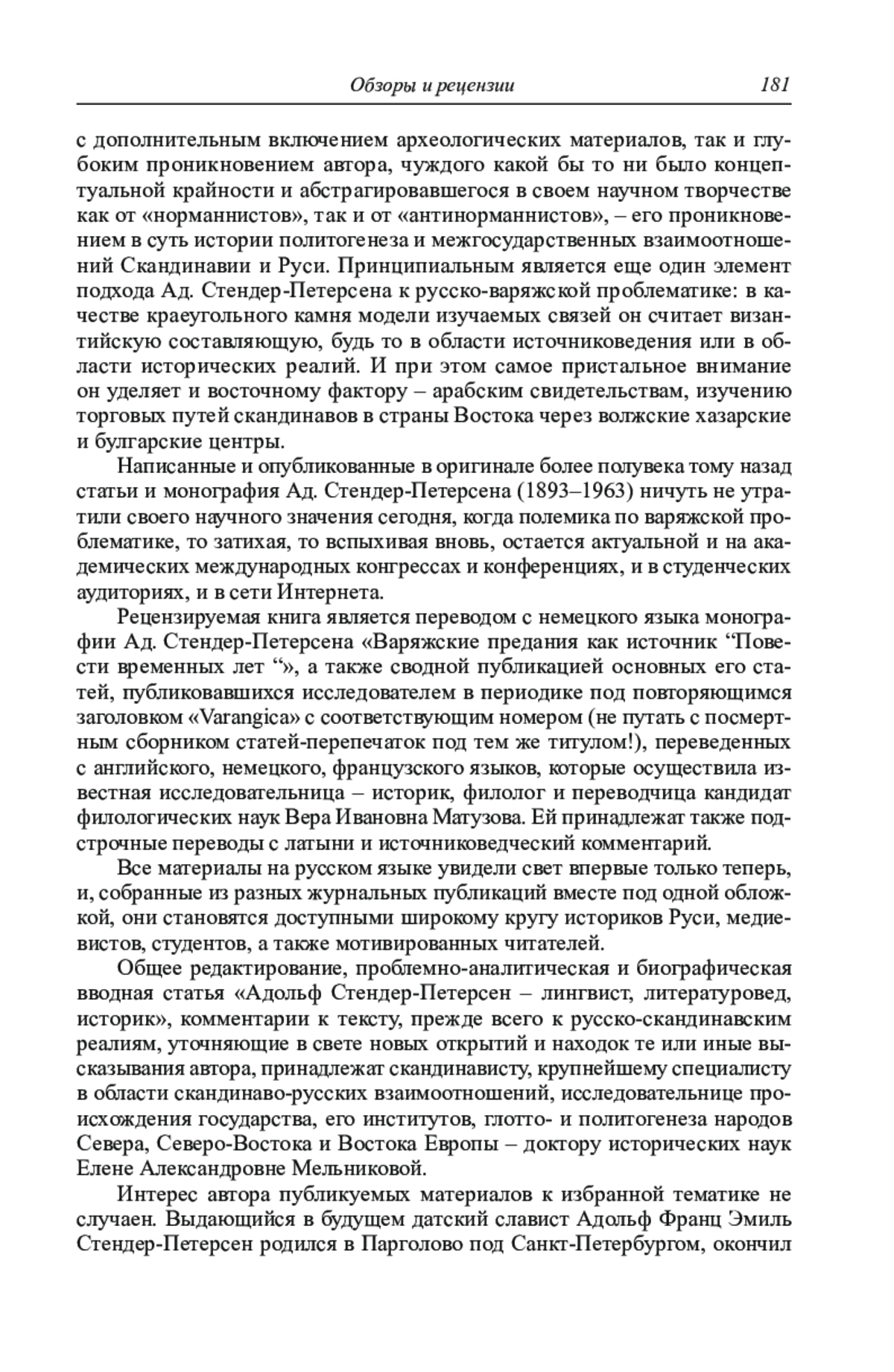 Недавний выход в свет книги Адольфа Стендер-Петерсена «Варангика: Историко-филологические исследования» может быть оценен как этап в длительной истории полемики по так называемой «норманнской» проблематике отечественной истории.