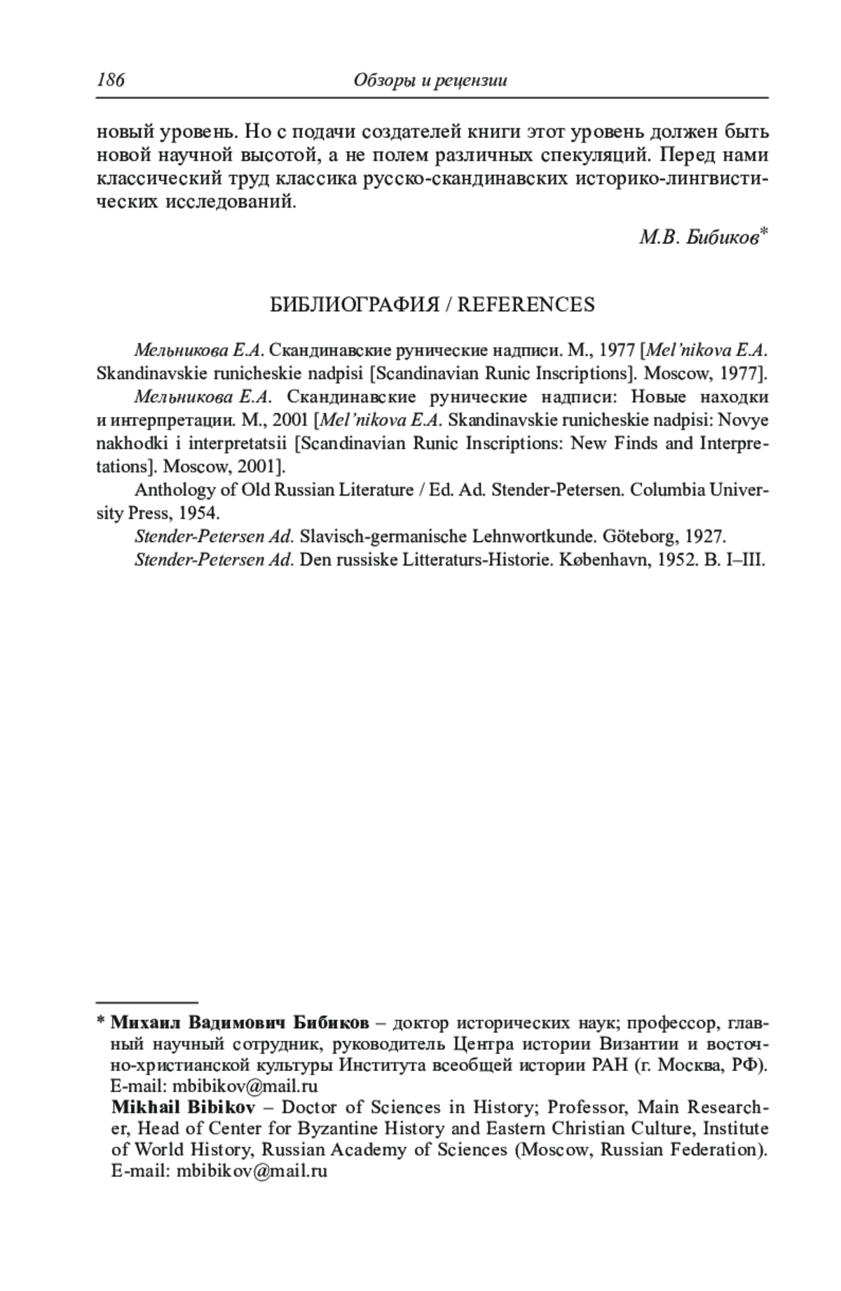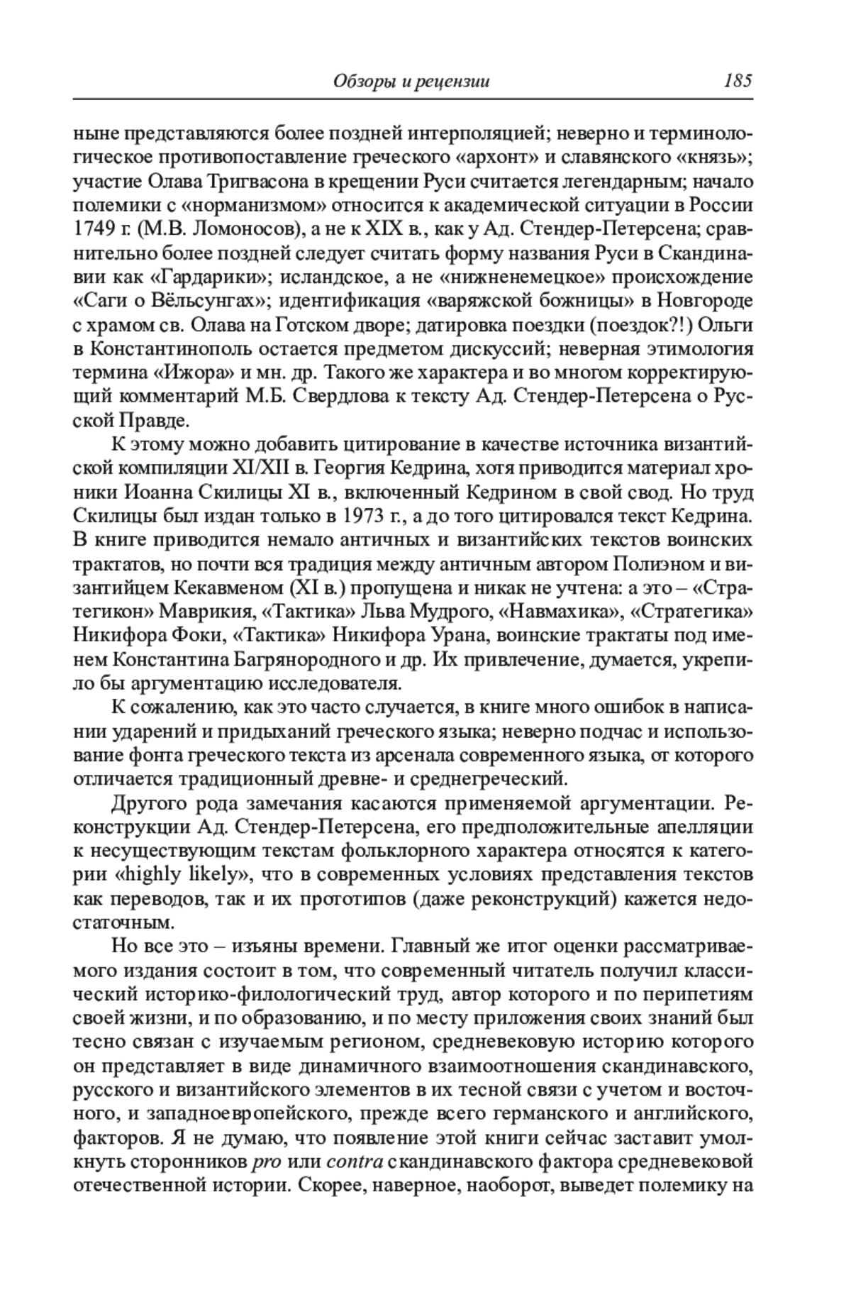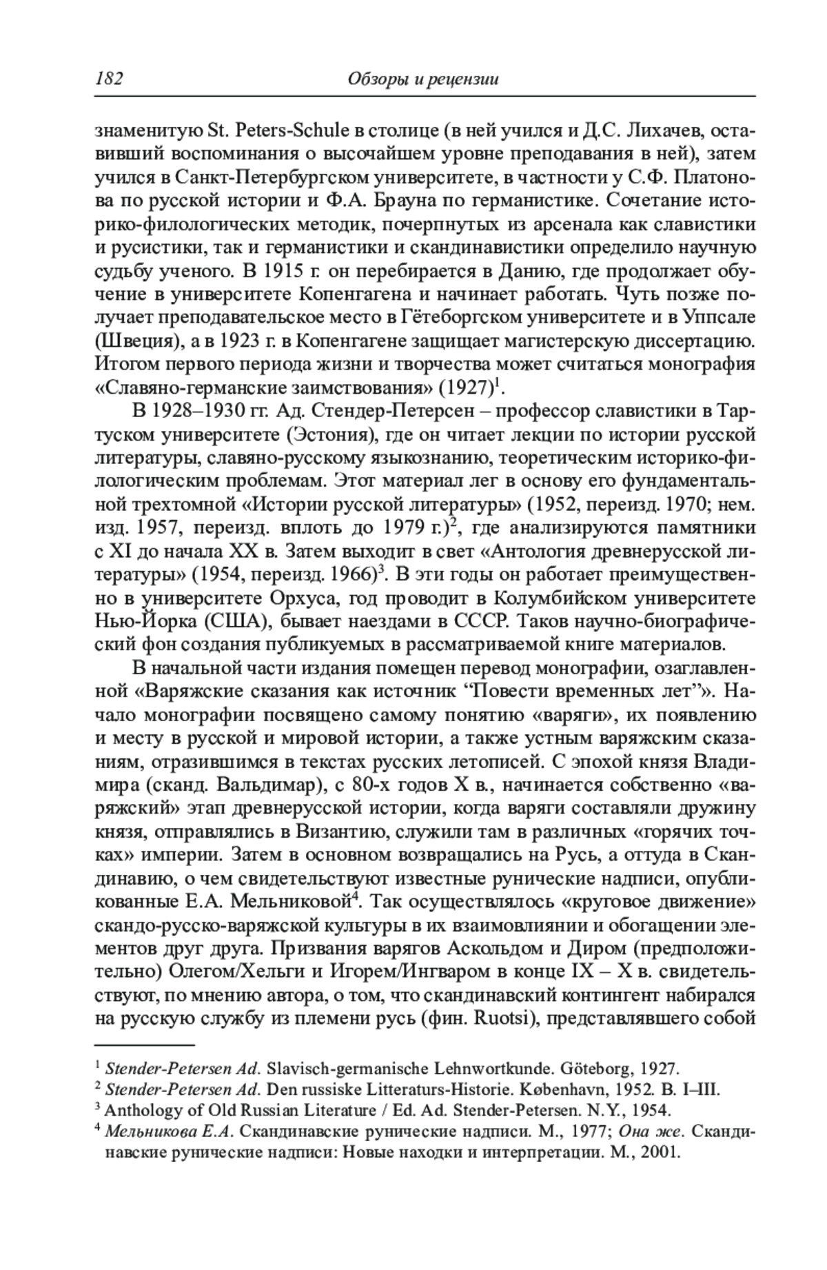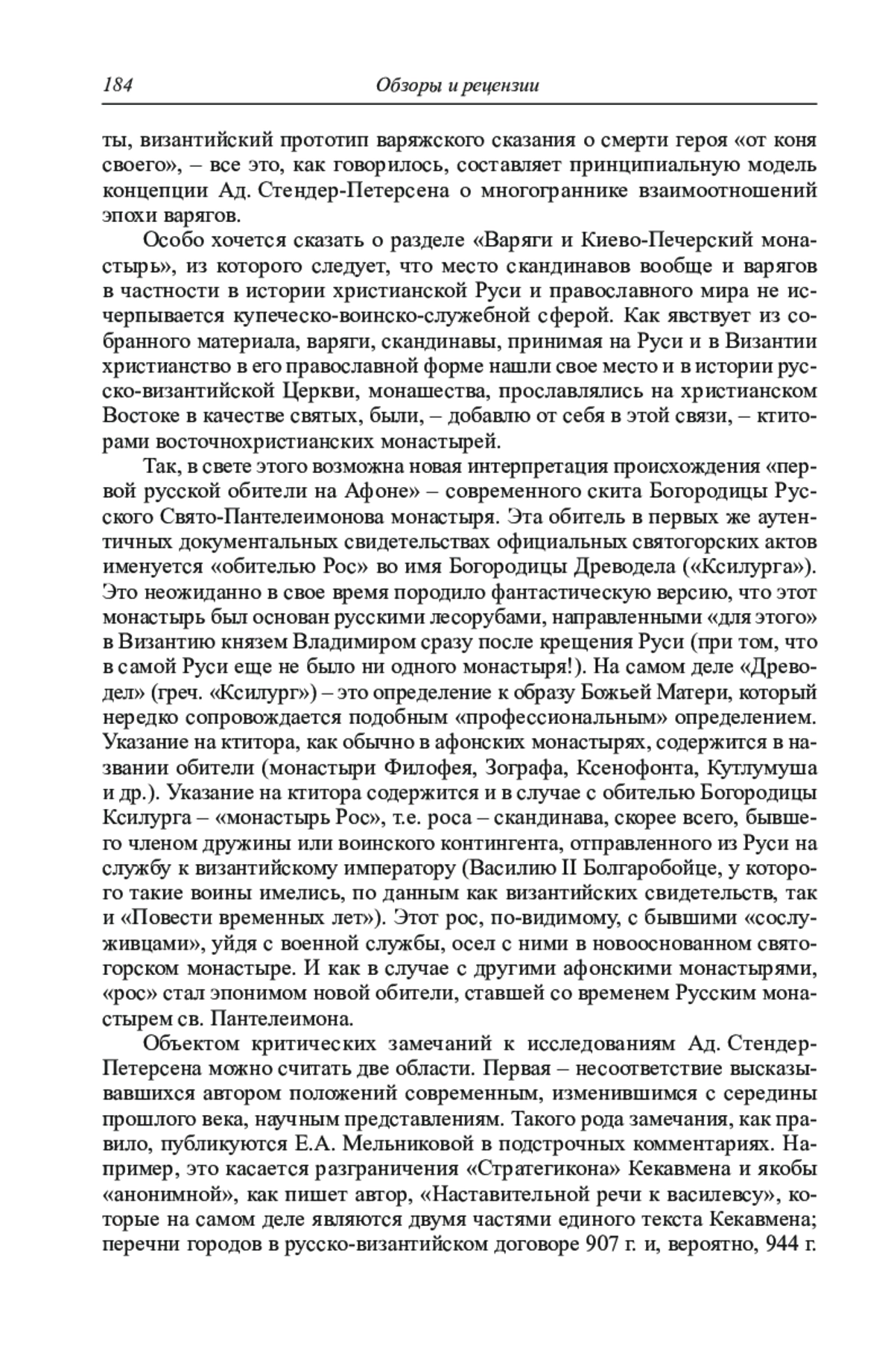 В рецензируемой книге впервые публикуются на русском языке переводы монографии и статей классика русско-скандинавских исследований – Адольфа Стендер-Петерсена, где в комплексе исследуются проблемы историко-культурного взаимодействия Византии, Руси и Скандинавии в IX–XI вв. Этимологии обозначений скандинавов в древнерусских памятниках рассматриваются в широком историко-культурном контексте с учетом эволюции их значений. Рецензент предлагает свою версию происхождения монастыря Рос(ов) на Афоне в свете анализируемой проблематики