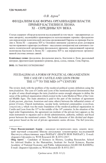 Статья содержит обзор результатов исследований (в том числе – предпринятых самим автором), касающийся правомерности использования термина «феодализм» для определения политической системы средневековой Европы на примере Кастилии и Леона XI – середины XIV в. Основное внимание уделяется роли договоров частно-правового характера (особенно – вассальных контрактов) как ключевого элемента политической организации феодального времени, определявший характер политикума Кастилии и Леона XI – середины XIV в. как иерархически организованной системы личных связей