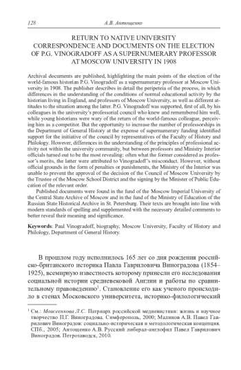Публикуются архивные документы, освещающие главные моменты избрания всемирно известного историка П. Г. Виноградова сверхштатным профессором Московского университета в 1908 г. Публикатор подробно характеризует перипетии процесса, в котором проявились различия в понимании условий нормальной образовательной деятельности историком, жившим в Англии, и профессорами Московского университета, а также разногласия между последними. Публикуемые документы хранятся в фонде Московского императорского университета Центрального государственного архива г. Москвы и в фонде Министерства народного просвещения Российского государственного исторического архива в Санкт-Петербурге. Их тексты приведены в соответствие с современными нормами орфографии и дополнены необходимыми детальными комментариями, позволяющими лучше раскрыть их смысл и значение