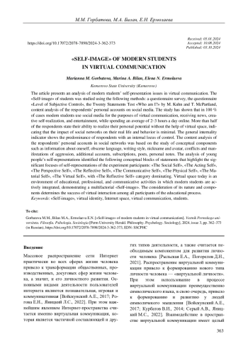 Представлены результаты исследования самопрезентации современной студенческой молодежи в пространстве виртуальной коммуникации. «Я-образ» студенческой молодежи изучался посредством следующих методов: анкетный опрос; опросник «Уровень субъективного контроля» (УСК); тест «Двадцать самоутверждений самоотношения “Кто Я?”» М. Куна и Т. Макпартленда; контент-анализ личных страниц респондентов в социальных сетях. Исследование показало, что современная студенческая молодежь в 100 % случаев использует социальные сети для целей виртуального общения, получения новостной информации, творческой самореализации, развлечения, проводя онлайн в среднем 2-3 часа в сутки. При этом более половины респондентов заявили о способности реализовать свой личностный потенциал без помощи виртуального пространства, указывая, что влияние социальных сетей на их реальную жизнь и поведение минимально. По показателю общей интернальности наблюдается преобладание респондентов с интернальным локусом контроля. Контент-анализ личных страниц респондентов в социальных сетях базировался на исследовании таких смысловых единиц изучаемого содержания, как информация о себе, нецензурная лексика, стиль письма, никнейм и аватар, конфликты и проявления агрессии, дополнительные аккаунты, подписки, посты, личные записи. По результатам анализа саморепрезентации молодежи выявлены следующие смысловые блоки высказываний, актуализирующие значимые фокусы самопредставлений участников эксперимента: «социальное Я», «деятельное Я», «перспективное Я», «рефлексивное Я», «коммуникативное Я», «физическое Я», «материальное Я», «виртуальное Я» с доминированием категории «рефлексивное Я». Виртуальное пространство сегодня - это среда образовательной, профессиональной, коммуникативной деятельности, в которую активно интегрирована современная студенческая молодежь, демонстрируя многофакторный «Я-образ». Учет его природы и составляющих предопределяет успешность виртуального взаимодействия между всеми участниками образовательного процесса.