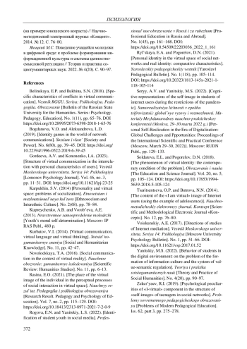 16. Яницкий М.С. Поведение учащейся молодежи в цифровой среде: к проблеме формирования информационной культуры и системы ценностно-смысловой регуляции // Теория и практика социогуманитарных наук. 2022. № 4(20). С. 90-97. EDN: FSRNCW