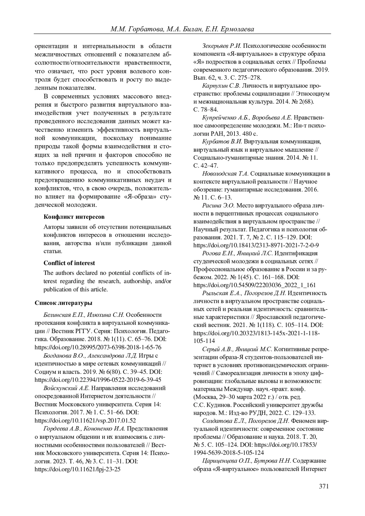 1. Белинская Е.П., Илюхина С.Н. Особенности протекания конфликта в виртуальной коммуникации // Вестник РГГУ. Серия: Психология. Педагогика. Образование. 2018. № 1(11). С. 65-76. DOI: 10.28995/2073-6398-2018-1-65-76 EDN: XTBCFN