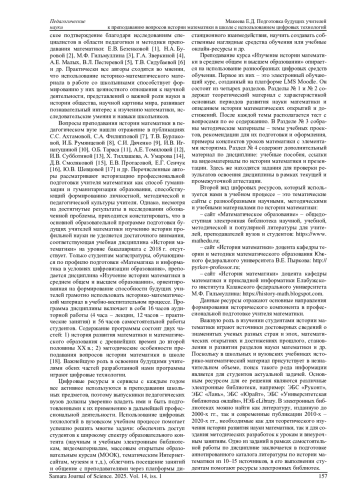 8. Бурлакова Т.В., Румянцева И.Б. О профессиональной направленности преподавания курса “История математики” в педагогическом вузе // Математика в школе. 2019. № 1. С. 10-17.