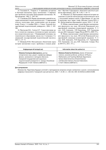 18. Макеева Е.Д. Преподавание вопросов истории математики студентам магистратуры педагогического вуза // Актуальные вопросы науки и образования: сб. мат-лов X междунар. науч.-практ. конф. (Москва, 8 июля 2024 г.). М.: Центр развития образования и науки, 2024. С. 65-68. EDN: FECZFR