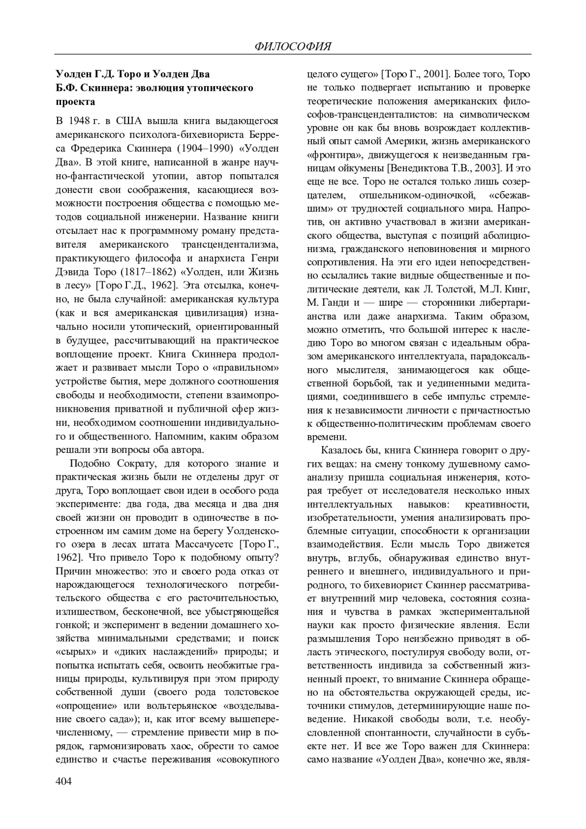 Статья посвящена генезису жанра социально-философской утопии в американской интеллектуальной культуре, что представляется весьма интересной темой для исследования, поскольку именно в утопии собираются воедино онтологические, гносеологические, антропологические, аксиологические, философско-исторические смыслы эпохи и культуры. Цель работы - обнаружить смысловое единство американской утопии и понять причины ее кризиса. Обращение к традиции американской утопии связано с тем значением, которое она имела для становления этой культуры и цивилизации как воплощенного «Града на холме», «Общества равных возможностей», «Маяка надежды». В качестве репрезентантов американской социально-философской утопии взяты Генри Торо, Беррес Фредрик Скиннер, Роберт Нозик и Ричард Рорти. Обращается внимание на отличительную черту американской утопии - ее открытый характер, отсутствие фундаментальных, заранее предопределенных установок, плюралистичность. Сделаны выводы о причинах кризиса утопического теоретизирования в американской культуре, что, на наш взгляд, связано с утвердившимся в общественном сознании эпохи позднего капитализма ощущением «конца истории», которое приводит к отказу от будущего в пользу бесконечного повторения одних и тех же сюжетов и обреченности на пребывание в застывшем времени; ретротопией как поиском оптимального жизненного проекта в прошлом, а не будущем; хонтологией как состоянием некогда бытовавшей, но так и не сбывшейся надежды на прогрессивное движение в будущее; конспирологией как способом объяснения мира через заговор и обман. Все это порождает разочарование для глобализированного общества позднего капитализма, депрессию как основной симптом времени, тоску по другим, уже недоступным сценариям развития культуры, щемящее чувство ностальгии.
