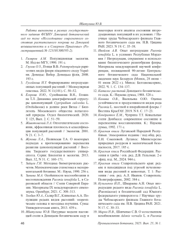 10. Ибатулина Ю.В. Натурные модели настоящей степи в Донецком ботаническом саду и некоторые итоги анализа состояния интродукционных популяций в их условиях // Научные труды Чебоксарского филиала Главного ботанического сада им. Н.В. Цицина РАН. 2023. N 19. С. 35-38.