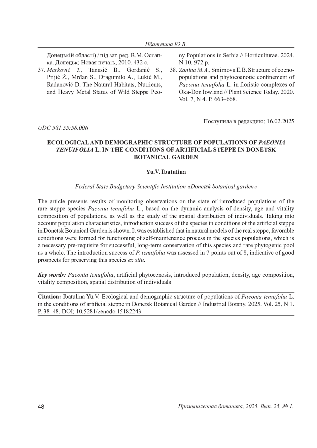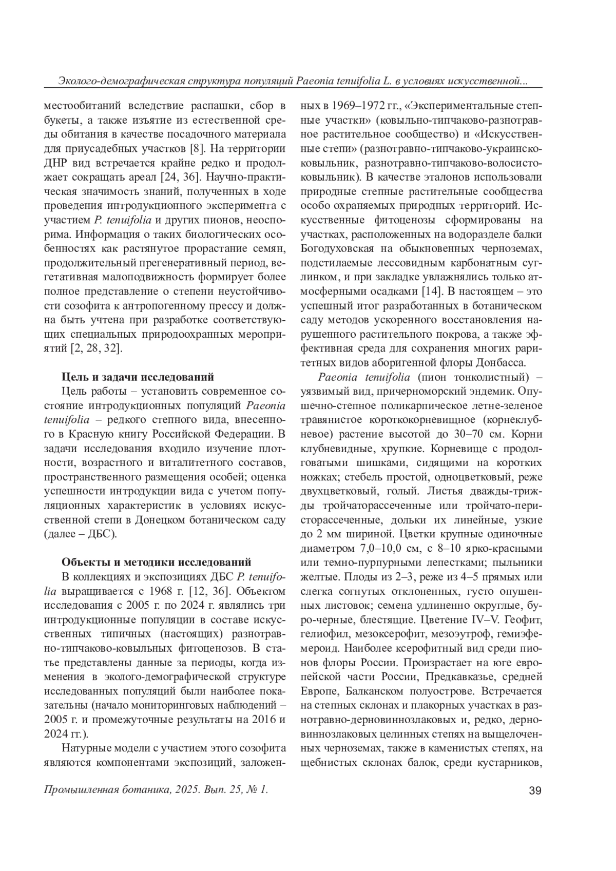 38. Zanina M.A., Smirnova E.B. Structure of coenopopulations and phytocoenotic confinement of Paeonia tenuifolia L. in floristic complexes of Oka-Don lowland // Plant Science Today. 2020. Vol. 7, N 4. P. 663-668.