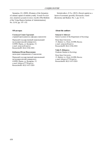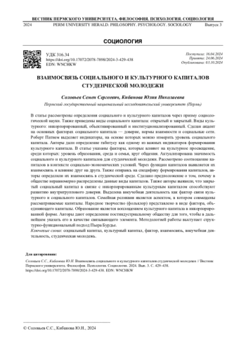 В статье рассмотрены определения социального и культурного капиталов через призму социологической науки. Также приведены виды социального капитала: открытый и закрытый. Виды культурного: инкорпорированный, объективированный и институционализированный. Сделан акцент на основных факторах социального капитала - доверие, нормы взаимности и социальные сети. Роберт Патнем выделяет индикаторы, на основе которых можно измерить уровень социального капитала. Авторы дали определение габитусу как одному из важных индикаторов формирования культурного капитала. В статье указаны факторы, которые влияют на культурное просвещение, среди которых: уровень образования, среда и семья, круг общения. Актуализирована значимость социального и культурного капиталов для студенческой молодежи. Рассмотрено соотношение капиталов в контексте социально-экономических условий. Через функции капиталов выявляется их взаимосвязь и влияние друг на друга. Также опираясь на специфику формирования капиталов, авторы определили их взаимосвязь в студенческой среде. Сделано предположение о том, почему в обществе неравномерно распределены данные виды капиталов. Также авторы выявили, что закрытый социальный капитал в связке с инкорпорированным культурным капиталом способствуют развитию внутригруппового доверия. Выделена внеучебная деятельность как фактор связи культурного и социального капиталов. Семейная реликвия является аспектом, в котором совмещены рассматриваемые капиталы. Народное творчество (фольклор) представлено в виде фактора, объединяющего капиталы. Образование является воплощением культурного капитала в инкорпорированной форме. Авторы дают определение постиндустриальному обществу для того, чтобы в дальнейшем указать его в качестве связывающего элемента. Методологией работы выступает структурно-функциональный подход Пьера Бурдье.