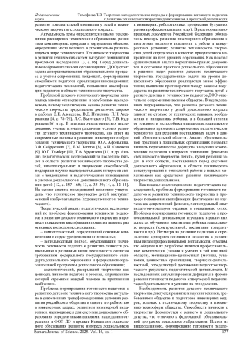 Статья: ТЕОРЕТИКО-МЕТОДОЛОГИЧЕСКИЕ ПОДХОДЫ К ФОРМИРОВАНИЮ ГОТОВНОСТИ ПЕДАГОГОВ К РАЗВИТИЮ ТЕХНИЧЕСКОГО ТВОРЧЕСТВА ДОШКОЛЬНИКОВ В ПРОЕКТНОЙ ДЕЯТЕЛЬНОСТИ (2025)