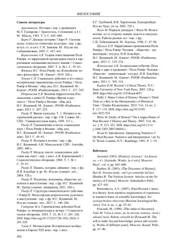 3. Борисенкова А.В. Теория повествования Поля Рикёра: от нарративной организации опыта к нарративным основаниям научного знания // Социологическое обозрение. 2007. Т. 6, № 1. С. 55-63. EDN: JWURTR