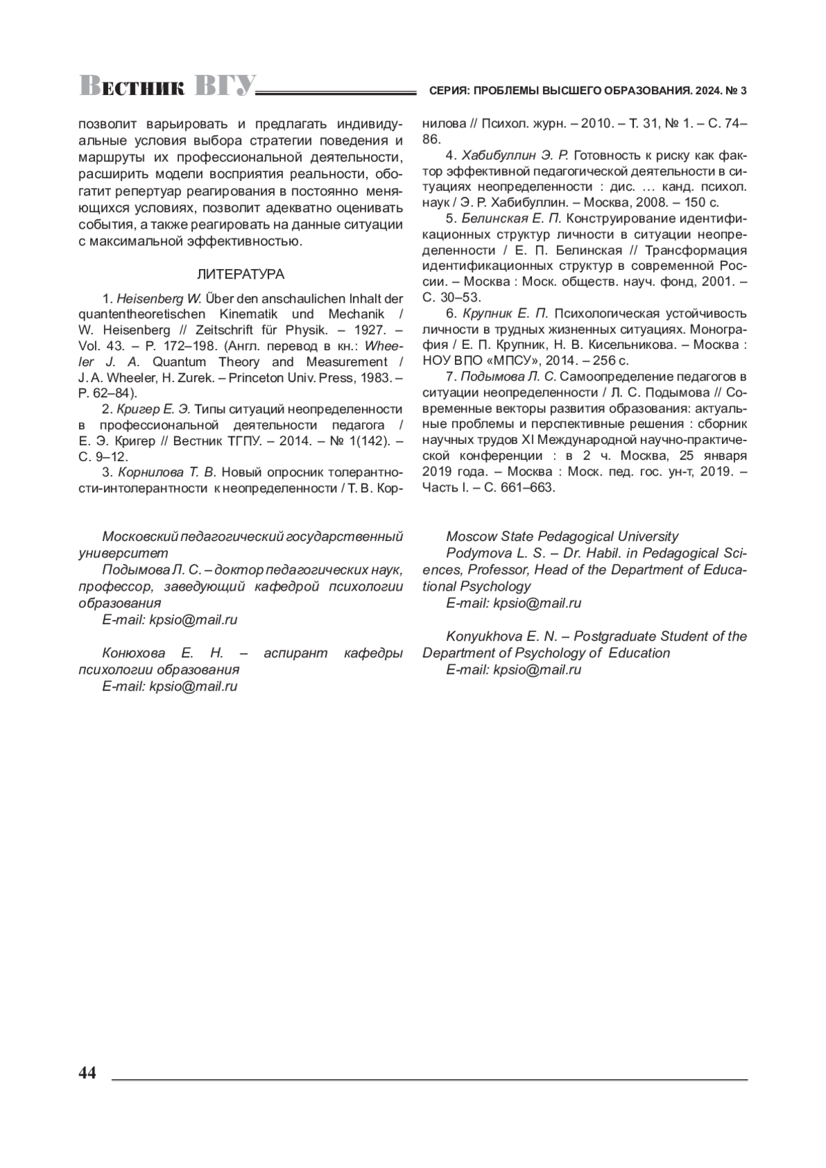3. Корнилова Т. В. Новый опросник толерантности-интолерантности к неопределенности / Т. В. Корнилова // Психол. журн. - 2010. - Т. 31, № 1. - С. 7486. EDN: MANCMP