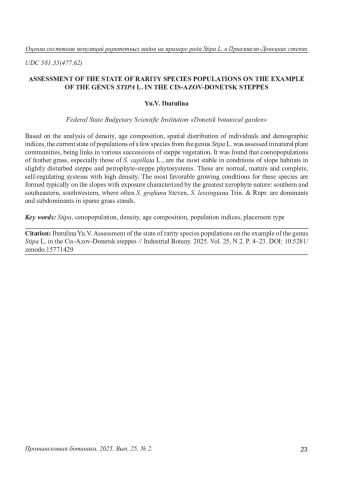 21. Ибатулина Ю.В. Состояние ценопопуляций Stipa ucrainica P.A. Smirn. в степных растительных сообществах в бассейне реки Миус // Экологический Вестник Северного Кавказа. 2024. Т. 20, N 3. С. 94-99.
