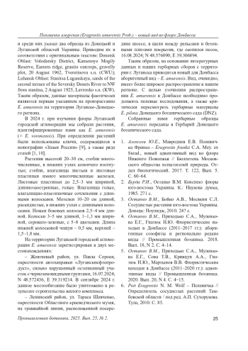 5. Остапко В.М., Приходько С.А., Муленкова Е.Г., Сова Т.В., Кривцун А.А., Гнатюк Н.Ю., Мартынов В.В. Флористические находки в Донбассе (2011-2020 гг.): адвентивные виды // Промышленная ботаника. 2020. Вып. 20, N 4. С. 4-15.