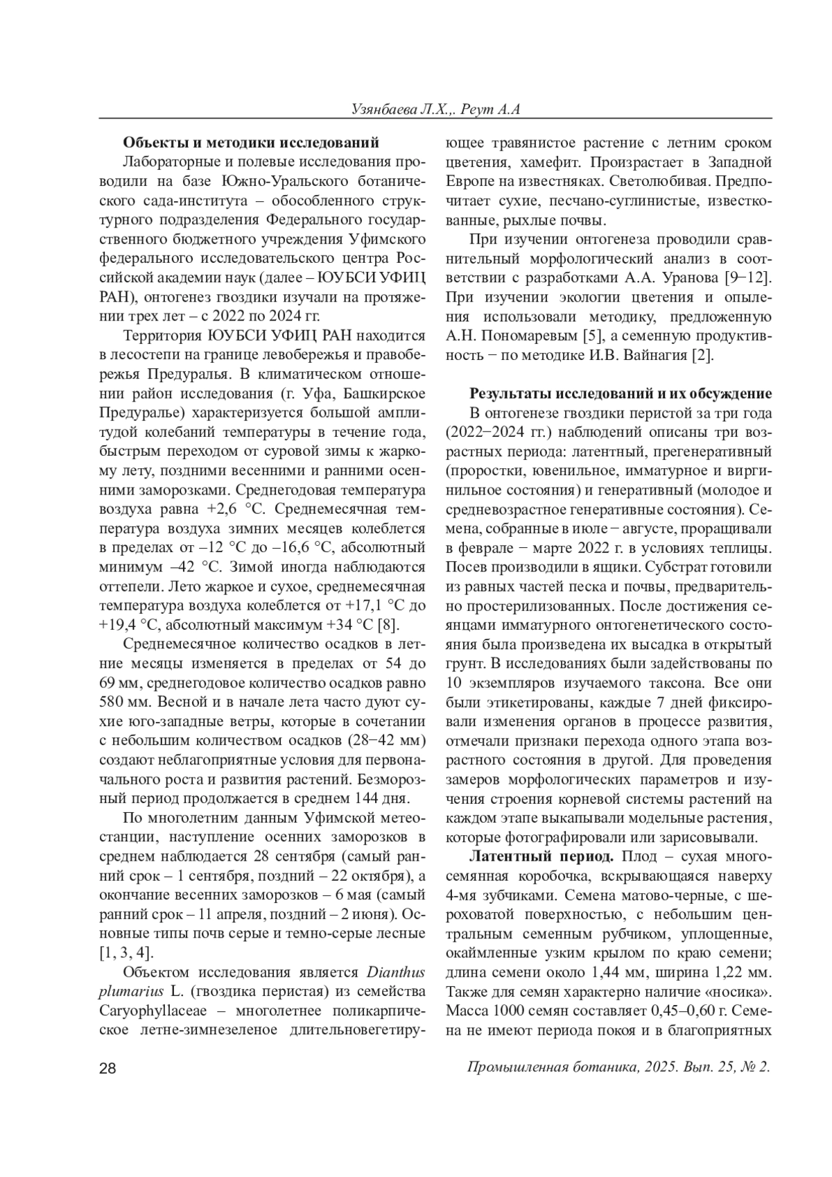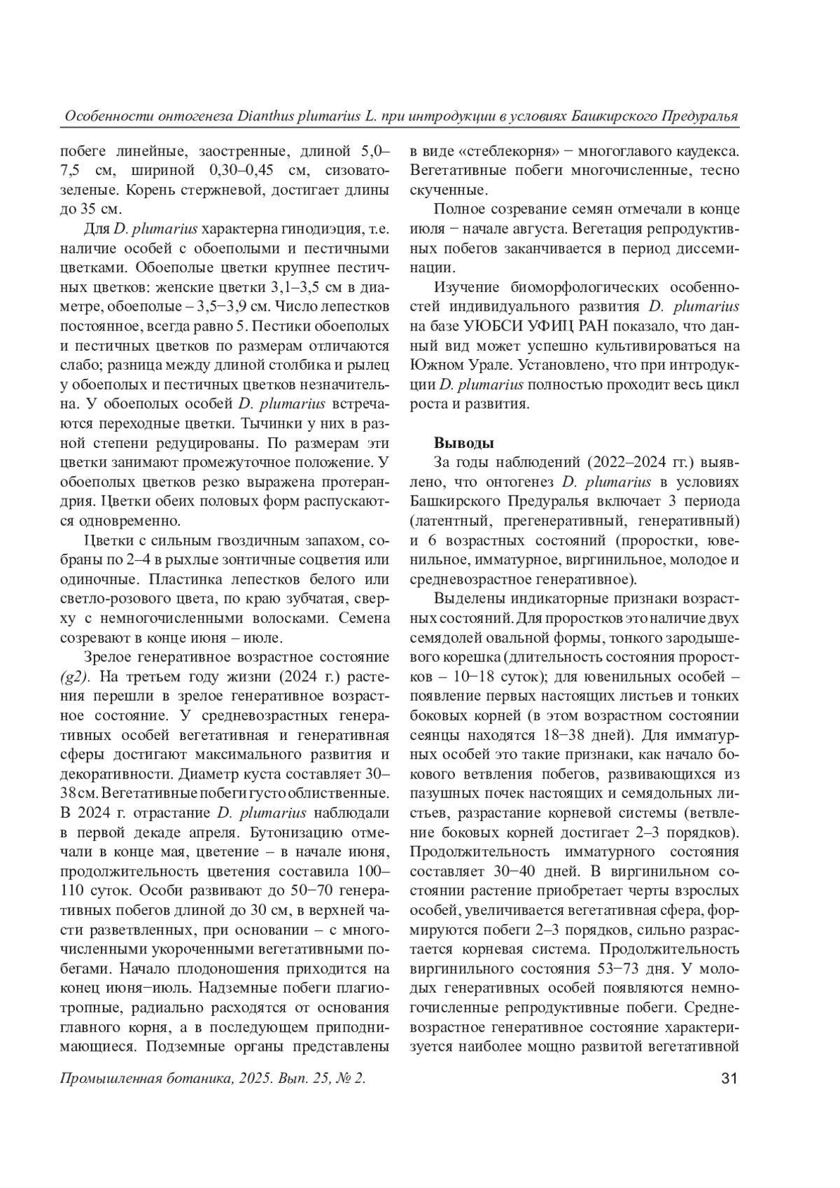 УЗЯНБАЕВА Л.Х., РЕУТ А. А. ОСОБЕННОСТИ ОНТОГЕНЕЗА DIANTHUSPLUMARIUS L. ПРИ ИНТРОДУКЦИИ В УСЛОВИЯХ БАШКИРСКОГО ПРЕДУРАЛЬЯ // ПРОМЫШЛЕННАЯ БОТАНИКА. 2025. № 2, ТОМ 25