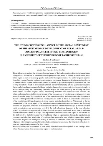 Целью статьи является анализ этноконфессионального аспекта реализации социально-гуманитарной составляющей концепта «устойчивое развитие сельских территорий» применительно к одному российскому полиэтничному региону, разработка конкретных способов его реализации. Предлагается авторская дефиниция понятия, акцентирующая внимание на его социально- гуманитарной составляющей. При этом устойчивое развитие сельских территорий понимается как целенаправленный и системный процесс, комплексно организуемый государственными органами, бизнесом и институтами гражданского общества на основе осуществления экономически эффективного и экологически оптимального аграрного воспроизводства посредством сбалансированного пространственного и других направлений социально-экономического развития села с целью достижения высокого и непрерывно улучшающегося образа жизни при сохранении и возрождении традиционных этнокультурных и этнорелигиозных ценностей, гармонизации межэтнических и межконфессиональных отношений. Исследование этноконфессионального аспекта социального содержания феномена «устойчивое развитие сельских территорий» проводится на примере одного из самых полиэтничных и многоконфессиональных регионов России - Республики Башкортостан. Данный регион по показателям этнической мозаичности населения и высокой дисперсности проживания этносов, в том числе - в сельской местности, лидирует в России. Применительно к реализации этнического аспекта концепции «устойчивое развитие сельских территорий» предлагаются, в том числе, такие мероприятия, как: содействие разворачиванию этнокультурной деятельности в селах различных самодеятельных общественных организаций и объединений; возрождение в системе сельского образования изучения национальных языков; организация в селах постоянно действующих этнических праздников, фестивалей, конкурсов этнической песни, танцев и других подобных этнокультурных мероприятий. Одновременно реализация конфессионального аспекта исследуемой концепции предполагает осуществление таких направлений деятельности, как: содействие возрождению традиционных религиозных организаций через регистрацию и строительство храмов; узаконение льгот и преференций для сельских религиозных общин; реализация специальных образовательных программ по целевой подготовке служителей церкви традиционных конфессий по принципу т. н. сельского священника; организация пропаганды традиционных этнорелигиозных ценностей жителей данного региона и их всесторонняя поддержка.