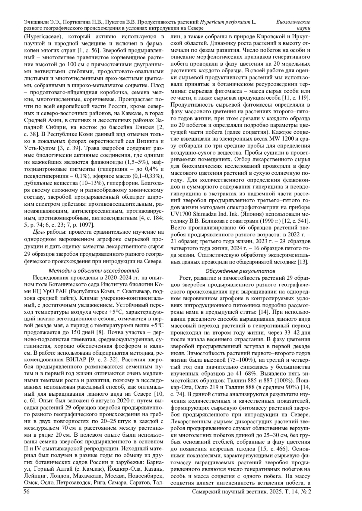 14. Эчишвили Э.Э., Портнягина Н.В., Пунегов В.В. Сравнительная морфобиологическая характеристика интродуцируемых на Севере образцов Hypericum perforatum разного географического происхождения // Самарский научный вестник. 2024. Т. 13, № 3. С. 72-80. DOI: 10.55355/snv2024133111 EDN: DOALWY