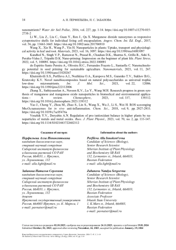 25. Venzhik Y. V., Deryabin A. N. Regulation of pro-/antioxidant balance in higher plants by nanoparticles of metals and metal oxides // Russ. J. Plant Physiol. 2023. Vol. 70, N 2. P. 133-147.