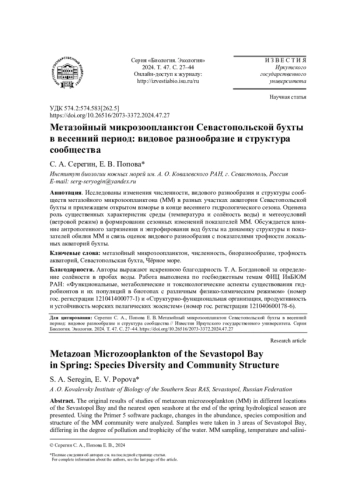 18. Серегин С. А., Попова Е. В. Обилие, видовое разнообразие и структура сообщества метазойного микрозоопланктона в градиенте бухта-взморье (на примере Севастопольской бухты) // Морской биологический журнал. 2023. Т. 8, № 2. С. 74-90. DOI: 10.21072/mbj.2023.08.2.05