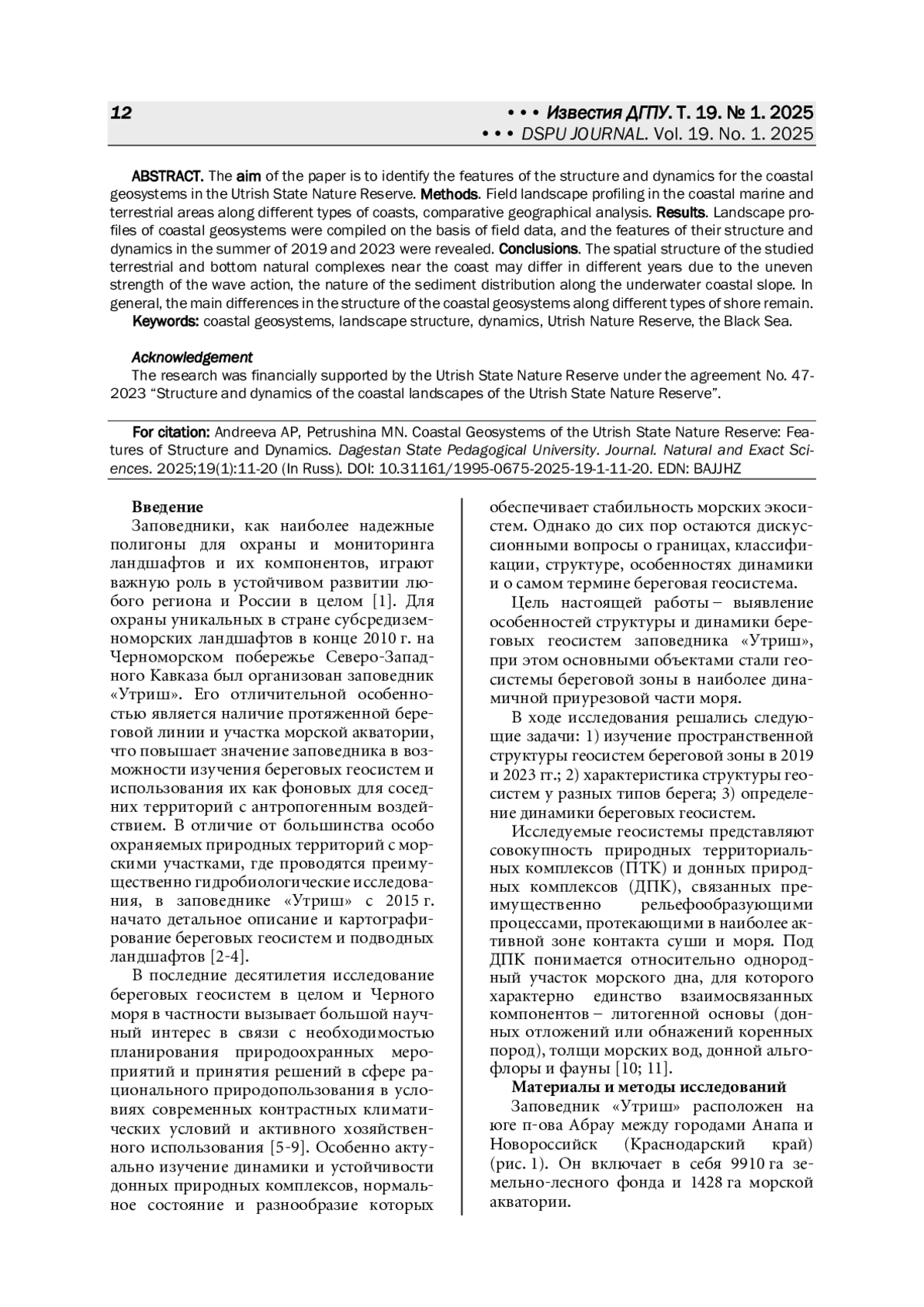 3. Андреева А. П. Особенности структуры береговых геосистем Черноморского побережья в районе Геленджика и заповедника “Утриш” // Наземные и морские экосистемы полуострова Абрау: история, состояние, охрана: научные труды. Анапа: Государственный природный заповедник “Утриш”. 2023. Т. 5. С. 202-206.