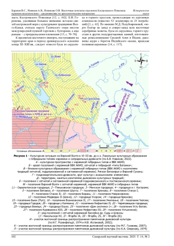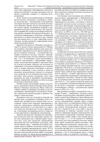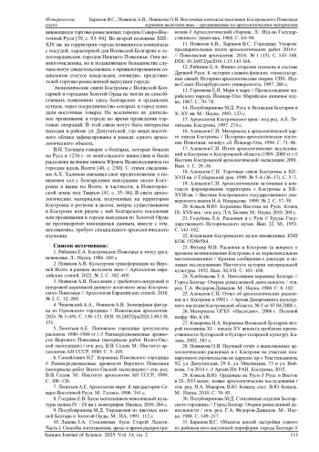 Статья посвящена анализу некоторых групп археологических материалов, полученных на территории Костромского Поволжья и города Костромы, имеющих восточное происхождение и определяющих контакты региона с областями Среднего Поволжья, Прикамья и Поветлужья. Хронологический диапазон бытования данных материалов предполагает наличие тесных взаимодействий уже в раннем железном веке и, несомненно, в средневековую эпоху. Археологическая фиксация таких культурных контактов позволяет получить более детальную и достоверную картину протекания социально-экономических, историко-культурных и этнокультурных процессов на территории Костромского края. В работе рассматривается значение региона как своеобразной контактной зоны, где в раннем железном веке происходит культурное и технологическое взаимодействие представителей двух крупнейших культурных общностей данной эпохи - ананьинской историко-культурной области (АКИО) и носителей сетчатых керамических традиций «верхневолжских типов». Для времени Средневековья анализируется состав археологических находок (фрагменты красноглиняной и кашинной посуды, монеты, железные предметы и проч.), которые могут характеризовать вероятные торговые и экономические контакты Костромского Поволжья с Волжской Болгарией и Золотой Ордой, а также затрагивается сюжет о возможном расселении волжских болгар на территории края в предмонгольское время.