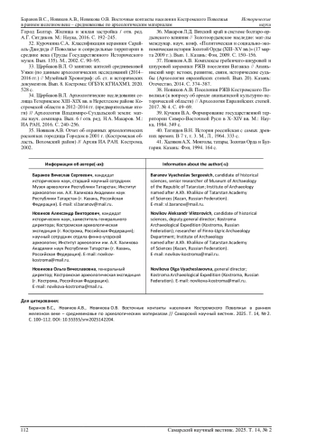 Изучение археологических материалов, полученных к настоящему времени на территории Костромского Поволжья, заставляет рассматривать появление и бытование в регионе восточного компонента не только как социальный и этнографический феномен, берущий начало в событиях рубежа позднего Средневековья – Нового времени, но имеющий более глубокие исторические основания.