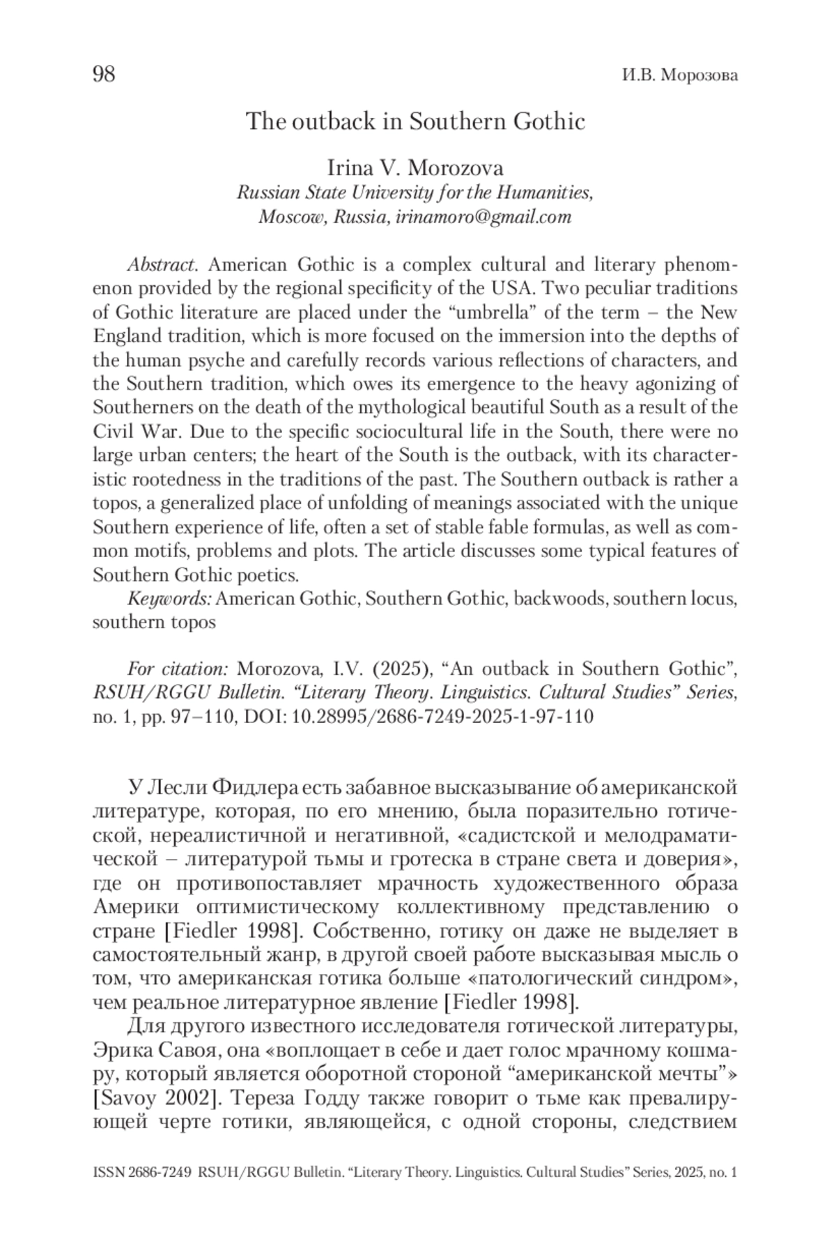 Американская готика представляет собой сложное культурное и литературное явление, обеспеченное региональной спецификой США. Под «зонтиком» термина помещаются две своеобразные традиции готической литературы – новоанглийская, в большей степени сфокусированная на погружении в глубины человеческой психики и тщательно фиксирующая различные рефлексии персонажей, и южная, обязанная своим появлением тяжелым переживаниям и размышлениям южан по поводу смерти мифологического прекрасного Юга в результате Гражданской войны. В силу специфической социокультурной жизни на Юге не было крупных урбанистических центров, сердцем Юга является глубинка, с характерной для нее укорененностью в традициях прошлого. Южная глубинка – скорее топос, обобщенное место разворачивания смыслов, связанных с уникальным южным опытом жизни, часто набор устойчивых фабульных формул, а также общих мотивов, проблем и сюжетов. В статье рассматриваются некоторые типические черты поэтики южной готики.