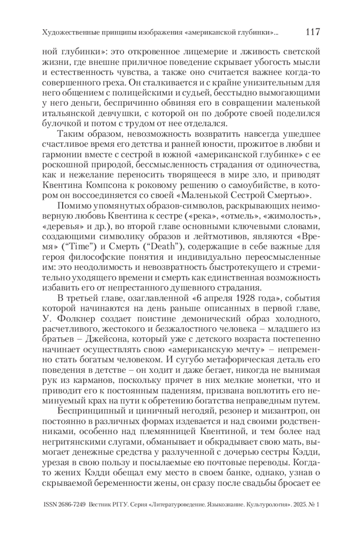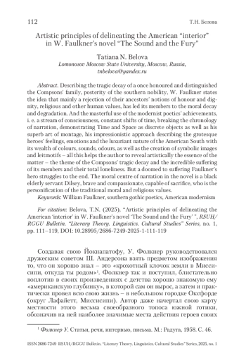 Американская готика представляет собой сложное культурное и литературное явление, обеспеченное региональной спецификой США. Под «зонтиком» термина помещаются две своеобразные традиции готической литературы – новоанглийская, в большей степени сфокусированная на погружении в глубины человеческой психики и тщательно фиксирующая различные рефлексии персонажей, и южная, обязанная своим появлением тяжелым переживаниям и размышлениям южан по поводу смерти мифологического прекрасного Юга в результате Гражданской войны. В силу специфической социокультурной жизни на Юге не было крупных урбанистических центров, сердцем Юга является глубинка, с характерной для нее укорененностью в традициях прошлого. Южная глубинка – скорее топос, обобщенное место разворачивания смыслов, связанных с уникальным южным опытом жизни, часто набор устойчивых фабульных формул, а также общих мотивов, проблем и сюжетов. В статье рассматриваются некоторые типические черты поэтики южной готики.