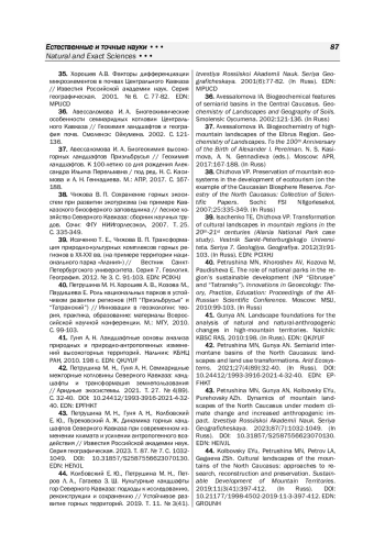 43. Петрушина М. Н., Гуня А. Н., Колбовский Е. Ю., Пуреховский А. Ж. Динамика горных ландшафтов Северного Кавказа при современном изменении климата и усилении антропогенного воздействия // Известия Российской академии наук. Серия географическая. 2023. Т. 87. № 7. С. 1032-1049. DOI: 10.31857/S2587556623070130
