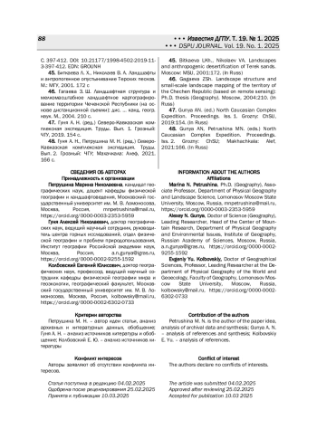42. Петрушина М. Н., Гуня А. Н. Семиаридные межгорные котловины Северного Кавказа: ландшафты и трансформация землепользования // Аридные экосистемы. 2021. Т. 27. № 4(89). С. 32-40. DOI: 10.24412/1993-3916-2021-4-32-40