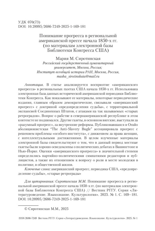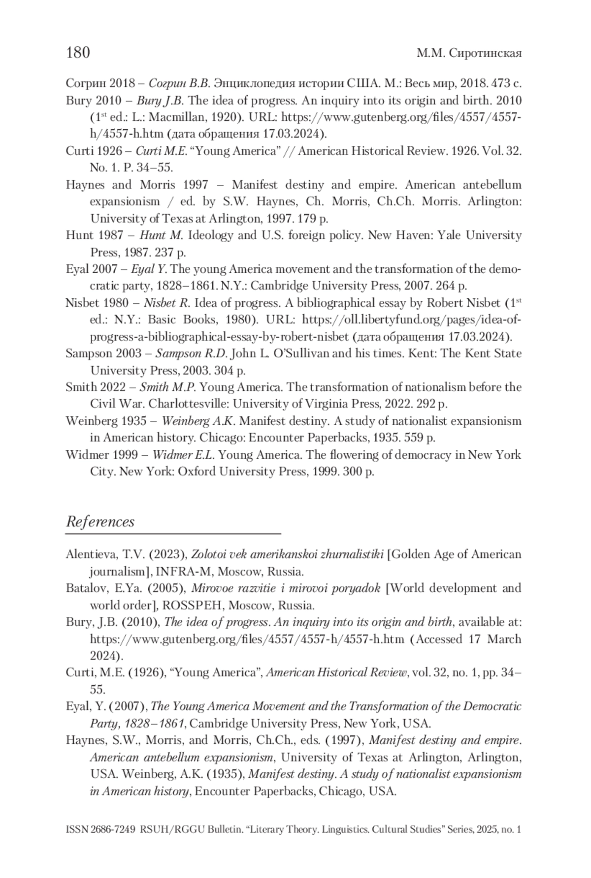 3. Сиротинская 2017 - Сиротинская М.М. Идея «предопределения судьбы» в восприятии американских современников: середина XIX в. // Вестник РГГУ. Серия «Политология. История. Международные отношения». 2017. № 2. С. 101-113.