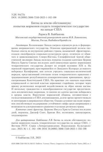 Колонизация Запада сыграла огромную роль в формировании американского государства. Освоение приграничной полосы свободных земель во внутренних районах страны, называемой «фронтиром», создало своеобразную социально-культурную среду, отличную от обжитого и цивилизованного Северо-Востока. Специфической чертой общественной эволюции Запада являлась попытка создания адептами Церкви Иисуса Христа Cвятых последних дней (именуемых кратко мормонами) теократического государства Дезерет во второй половине ХIХ в. На огромной территории, простиравшейся от Западного Колорадо до южного побережья Калифорнии, они хотели учредить социально-политический порядок, представлявший сочетание основ теократического правления с традиционными республиканско-демократическими принципами, предусмотренными Конституцией США. На практике это означало наделение клерикальной и светской властью церковных старейшин, которые через призму религиозных воззрений воздействовали на образ жизни паствы. И поскольку гражданство в новообразованном государстве предоставлялось исключительно мормонам, то именно их адепты массово избирались в органы власти. Вероучение мормонской общины, несовместимое с господствовавшими в США деноминациями, долгое время препятствовало ее интеграции в американское общество. Однако духовное наследие мормонов способствовало поддержанию устойчивого мифа среди американцев о возможности альтернативного развития отдельных регионов страны.