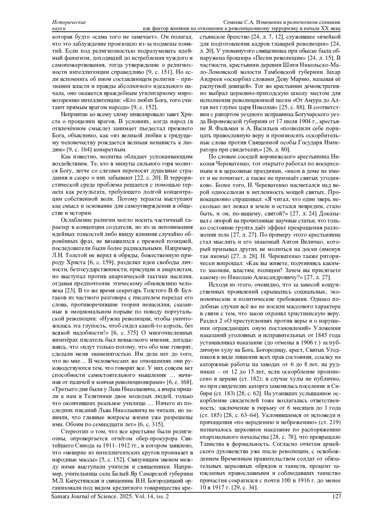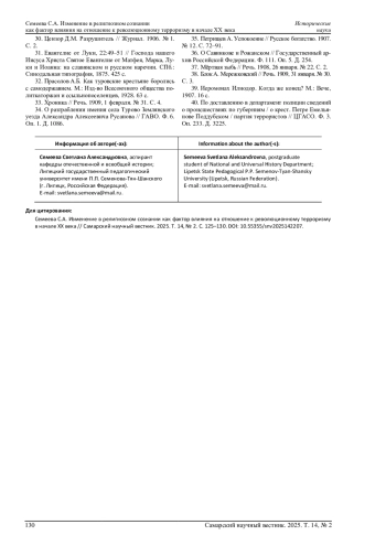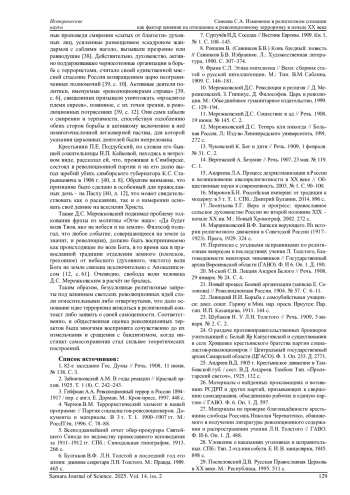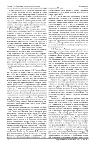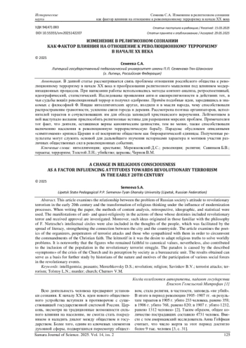 СЕМЕЕВА С. А. ИЗМЕНЕНИЕ В РЕЛИГИОЗНОМ СОЗНАНИИ КАК ФАКТОР ВЛИЯНИЯ НА ОТНОШЕНИЕ К РЕВОЛЮЦИОННОМУ ТЕРРОРИЗМУ В НАЧАЛЕ XX ВЕКА // САМАРСКИЙ НАУЧНЫЙ ВЕСТНИК. 2025. ТОМ 14, № 2