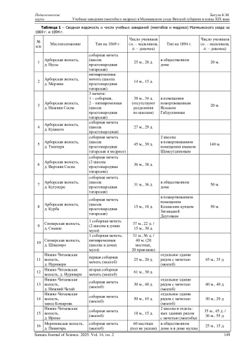 Актуальность исследования учебных заведений начальной школы (мектебов) и медресе в Малмыжском уезде Вятской губернии конца XIX века обусловлена их ключевой ролью в формировании системы образования, сохранении этнокультурной идентичности и религиозно-нравственных ценностей татарского народа.
