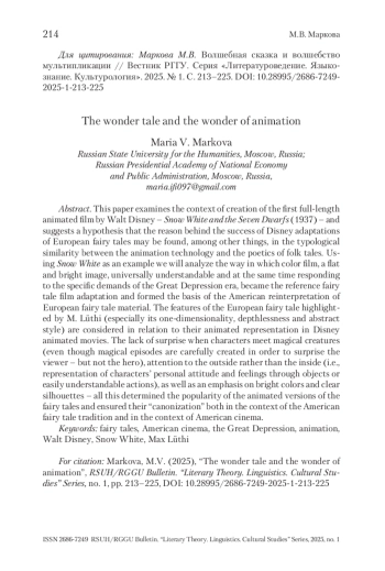 В статье рассматривается контекст создания первого полнометражного анимационного фильма киностудии Уолта Диснея – «Белоснежка и семь гномов» (1937) – и приводится гипотеза о том, что успех диснеевских экранизаций европейских сказок связан в том числе с типологическим сходством технологии мультипликации и поэтики народной сказки. На примере «Белоснежки» проанализировано, каким образом цветной фильм, представляющий плоское и яркое изображение, одновременно универсально понятное и отвечающее на запросы эпохи Великой депрессии, стал эталонной экранизацией сказки и лег в основу американского переосмысления европейского сказочного материала. Черты европейской сказки, выделенные М. Люти (в особенности одномерность, отсутствие глубины и абстрактный стиль), рассматриваются в соотношении с их анимационной репрезентацией в диснеевских мультфильмах. Отсутствие удивления персонажей при встрече с волшебными существами (при тщательной проработке волшебных эпизодов с целью удивить зрителя – но не героя), внимание к внешнему, а не к внутреннему (т. е. репрезентация характера и чувств героев через предметы или понятные поступки), а также акцент на ярких цветах и четких силуэтах – все это определило популярность мультипликационной версии сказки и обеспечило ее «канонизацию» как в контексте американской сказочной традиции, так и в контексте американского кинематографа.