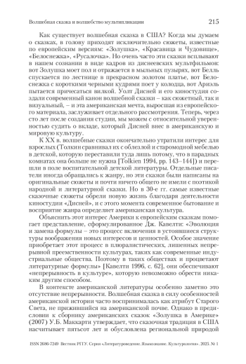 Статья посвящена диалогу со сказочной традицией, представленному в анимационном фильме компании Дисней «Принцесса и лягушка» (2009). В основе сценария – детская книга американской писательницы Элизабет Доусон Бейкер «Принцесса-лягушка» (2002), представляющая собой интерпретацию сюжета сказки Братьев Гримм «Король-лягушонок, или Железный Генрих» (1812). Помимо характеристики особенностей художественного взаимодействия претекстов и кинотекста, обращение к мультфильму «Принцесса и лягушка» также предоставляет возможность выявить специфику существенных модификаций в диснеевском каноне. Трансформация типичного образа принцессы; смещение акцента с ожидания «принца на белом коне» в роли спасителя на идею об осуществлении мечты о карьере и независимости; изображение синтеза французской, афроамериканской и «белой» американской культур – все это позволяет определить рассматриваемый нами материал как продукт нового времени, выступающий в качестве визуализации фундаментальных изменений в социуме и культуре. В ходе анализа, выстроенного согласно принципам историко-литературного и сопоставительного методов исследования, мы приходим к выводу об эволюции сказочной традиции и архетипов в контексте современной гетерогенной действительности, где обращение к классике выступает в качестве своеобразной платформы для реализации актуальных идей.