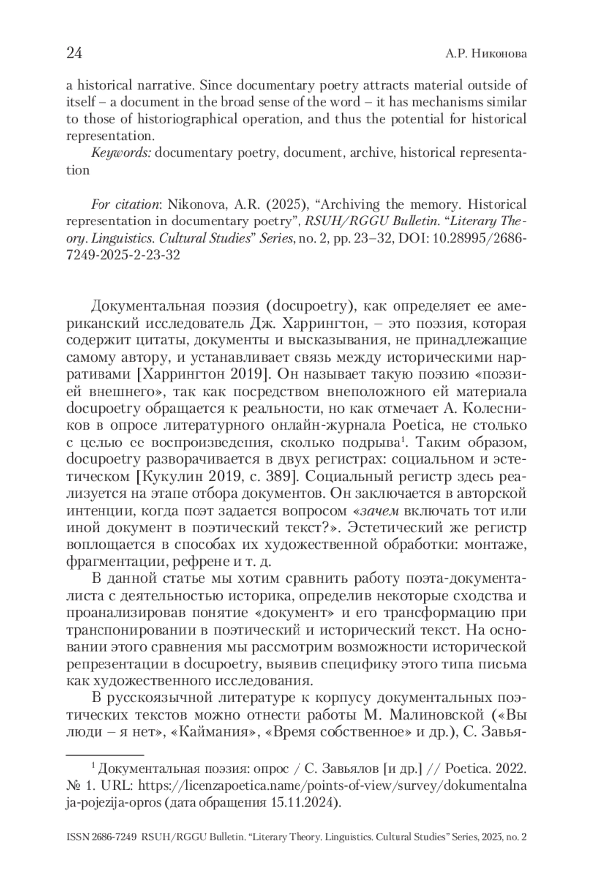 Статья посвящена выявлению связи между документальной поэзией (docupoetry) и исторической репрезентацией. Историческая репрезентация – придание прошлому присутствия в настоящем. Согласно П. Рикёру, это финальная фаза историографической операции, которая заключается в отборе документов, свидетельств и фактов, их структурировании и выстраивании в исторический нарратив. Поскольку документальная поэзия привлекает внеположный ей материал – документ в широком смысле слова – она имеет схожие с историографической операцией механизмы работы, а значит, потенциал к исторической репрезентации.