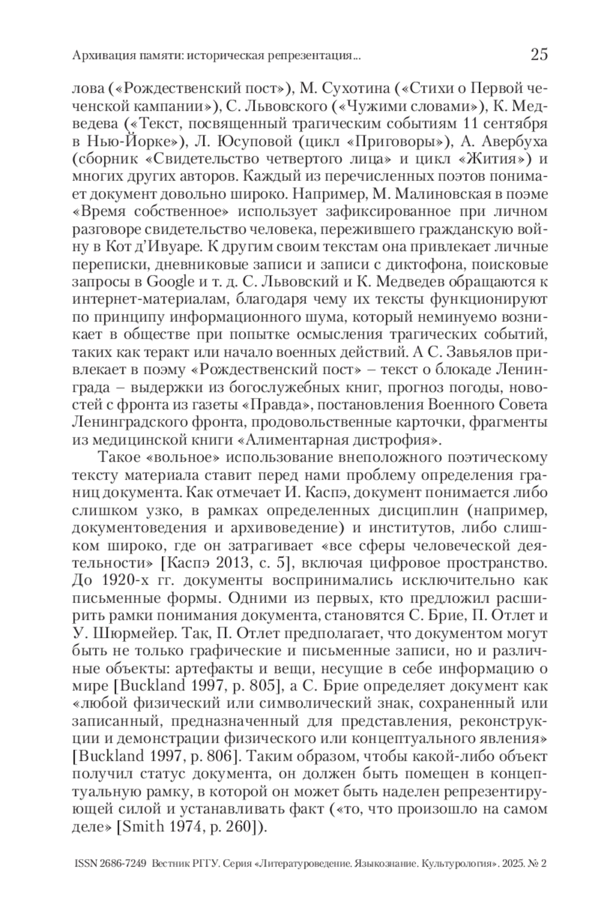 Подобно историку, для создания документальной поэзии автор производит поиск и отбор документов согласно своей авторской интенции и транспонирует их в поэтический текст. Тем самым он проводит границу, задает пространство своего «архива» – текста или цикла – и рецептивную рамку, которую В. Лехциер называет «фреймом документальности» [Лехциер 2018].