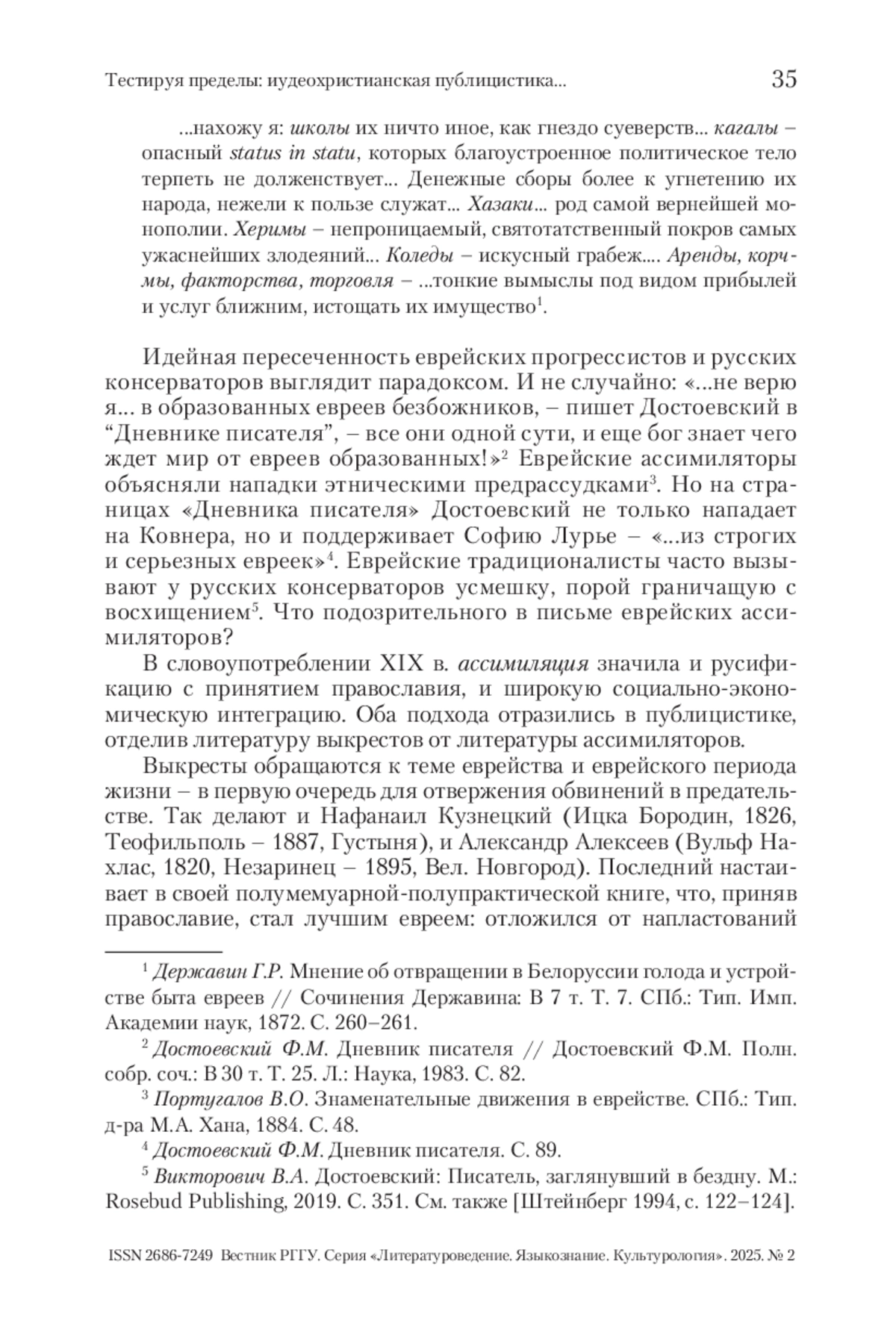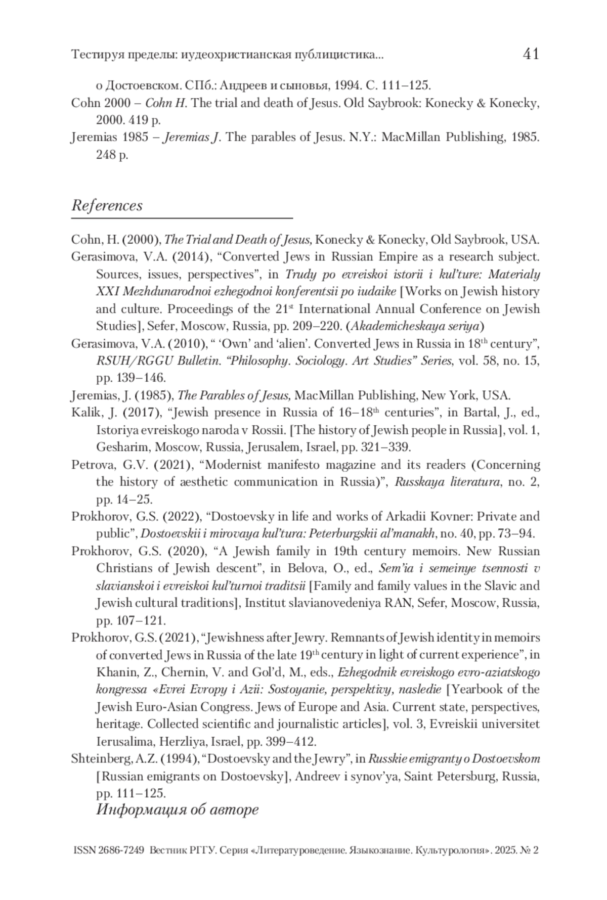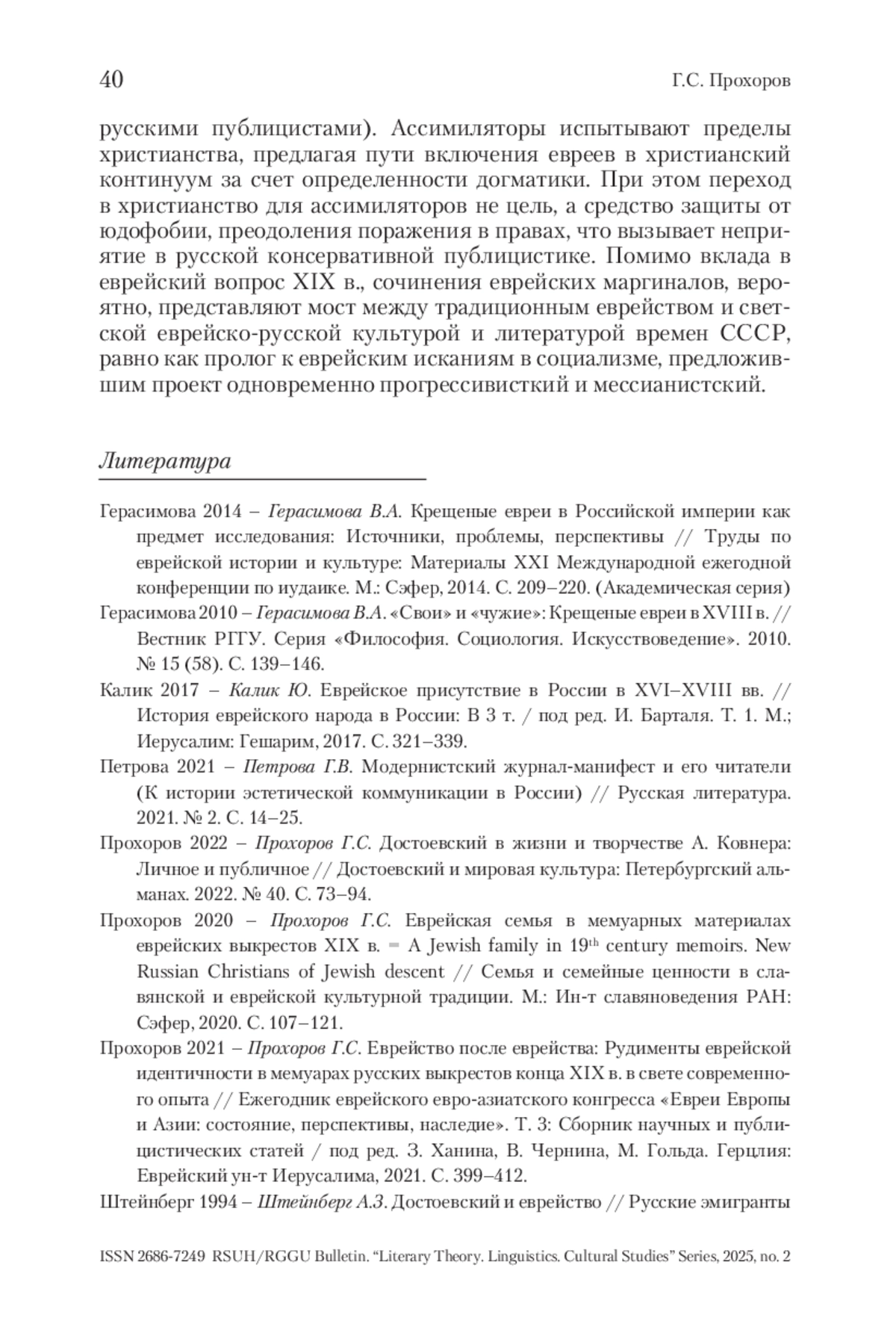 7. Прохоров 2021 - Прохоров Г.С. Еврейство после еврейства: Рудименты еврейской идентичности в мемуарах русских выкрестов конца XIX в. в свете современного опыта // Ежегодник еврейского евро-азиатского конгресса «Евреи Европы и Азии: состояние, перспективы, наследие». Т. 3: Сборник научных и публицистических статей / под ред. З. Ханина, В. Чернина, М. Гольда. Герцлия: Еврейский ун-т Иерусалима, 2021. С. 399-412.