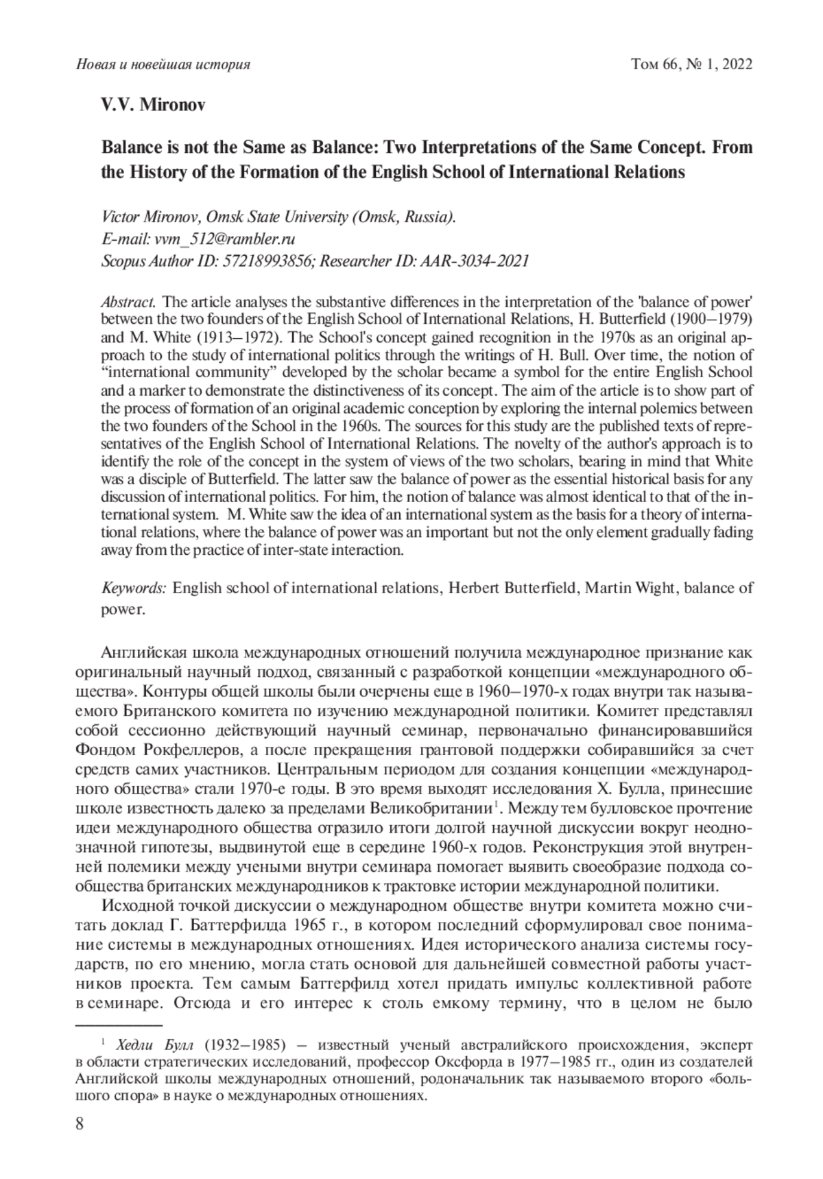 МИРОНОВ В. В. БАЛАНС БАЛАНСУ РОЗНЬ: ДВЕ ИНТЕРПРЕТАЦИИ ОДНОГО КОНЦЕПТА. ИЗ ИСТОРИИ ФОРМИРОВАНИЯ АНГЛИЙСКОЙ ШКОЛЫ МЕЖДУНАРОДНЫХ ОТНОШЕНИЙ // НОВАЯ И НОВЕЙШАЯ ИСТОРИЯ. 2022. № 1