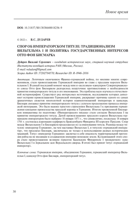 Логичным окончанием Франко-германской войны, по мнению многих современников, стало провозглашение Германской империи во главе с прусским королем Вильгельмом I. В самый последний момент между ним и «железным» канцлером Северогерманского союза Отто фон Бисмарком разгорелось нешуточное противостояние о необходимости принятия императорского титула и его именования. Эта проблема мало изучена в отечественной историографии. Существует ряд интересных источников, исследование которых дополняет историю провозглашения Германской империи, раскрывает причины одного из самых драматичных сюжетов многолетней истории взаимоотношений императора и канцлера. Бисмарк связывал принятие императорского титула с успехом продолжения процесса имперской интеграции. Это было важнее простого стремления Вильгельма I к признанию германскими князьями превосходства прусской короны в Германии. Итогом проявленной Бисмарком инициативы по подготовке «Императорского письма» стало согласие Вильгельма I на принятие императорского титула. Датой провозглашения прусского короля Вильгельма германским императором было выбрано 18 января 1871 г., что символично, поскольку 18 января 1701 г. состоялась коронация курфюрста Бранденбурга Фридриха III королем Пруссии. Спор между Вильгельмом I и Бисмарком продолжился из-за именования титула. Разница между титулом «император Германии», на чем настаивал Вильгельм I, и титулом «германский император», что предлагал Бисмарк, заключалась не только в использовании разных исторических традиций. Титул «император Германии» заключал в себе опасность территориальной претензии рейха на не входящие в создаваемую империю немецкие земли. Кульминацией этого спора стало провозглашение великим герцогом Баденским Фридрихом I троекратного «ура» Вильгельму I в Зеркальном зале Версальского дворца. В итоге был принят титул «германский император»