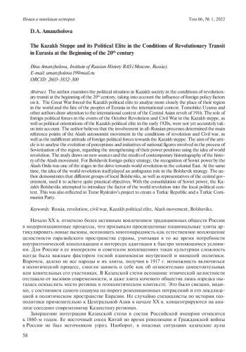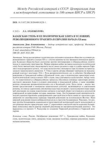 Начало XX в. отмечено более активным вовлечением традиционных обществ России в модернизационные процессы, что призывало просвещенные национальные элиты артикулировать новые вызовы, осознавать многонародность как естественное воплощение целостности евразийского пространства страны, учитывая в то же время потребности внутриэтнической консолидации в интересах адаптации к быстро меняющимся условиям. Для России в ее имперском и советском воплощениях такая культурная сложность всегда была важным фактором тесной взаимосвязи внутренней и внешней политики. Впрочем, далеко не все народы и их элиты, получив в 1917 г. возможность включиться в политический процесс, смогли заявить о себе как об относительно самостоятельных или влиятельных его участниках. В Казахской степи осознание этнической целостности отставало от вызовов современности, и даже элита кочевого общества лишь изредка пыталась осмыслить место региона в геополитическом контексте. Это было связано, видимо, с состоянием самого социума на пороге революционных потрясений и его локализацией в политическом пространстве Евразии. Не случайно специалисты по истории геополитики применительно к Центральной Азии в начале XX в. концентрируются на анализе соседних современному Казахстану регионах.