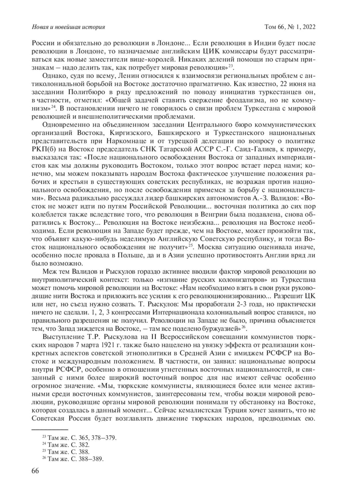 Автор рассматривает политическую ситуацию в казахском обществе в условиях революционного транзита в начале XX в. с учетом влияния на нее внешнеполитических факторов. Казахское общество было достаточно прочно интегрировано в общероссийское политическое и социальное пространство. Первая мировая война заставила казахскую политическую элиту более внимательно анализировать место своего региона в мире и судьбы народов Евразии в международном аспекте, что пока недостаточно учитывается при изучении истории казахского национального движения. Т. Уяма и другие авторы обращают внимание на международный контекст восстания 1916 г. Роль внешнеполитических сил в событиях Октябрьской революции и Гражданской войны в Казахской степи, как и политических ориентирах казахской политической элиты в начале 1920-х годов, пока учитывается недостаточно. Автор считает, что вовлеченность в общероссийские процессы обусловила основные ориентиры автономистского движения Алаш в условиях революции и гражданской войны, а также индифферентное отношение внешнеполитических сил к Казахской степи. Цель статьи – анализ эволюции представлений и инициатив национальных деятелей, включившихся в советизацию региона, по поводу укрепления собственных властных позиций с использованием идеи мировой революции на основе вовлеченных автором в научный оборот источников и результатов современной историографии истории движения Алаш. Для большевистской внешнеполитической стратегии признание алашординцами советской власти было одним из эпизодов в продвижении по своеобразному коридору мировой революции на колониальном Востоке. Идея мировой революции играла амбивалентную роль в стратегии большевиков. Показано, что разные группы большевиков-националов и представителей центральной власти использовали ее для решения вполне практических задач. С укреплением советской власти казахские большевики попытались ввести фактор мировой революции во внутриполитический контекст. Это выразилось и в проекте Т. Рыскулова по созданию Тюркской республики и Тюркской компартии.