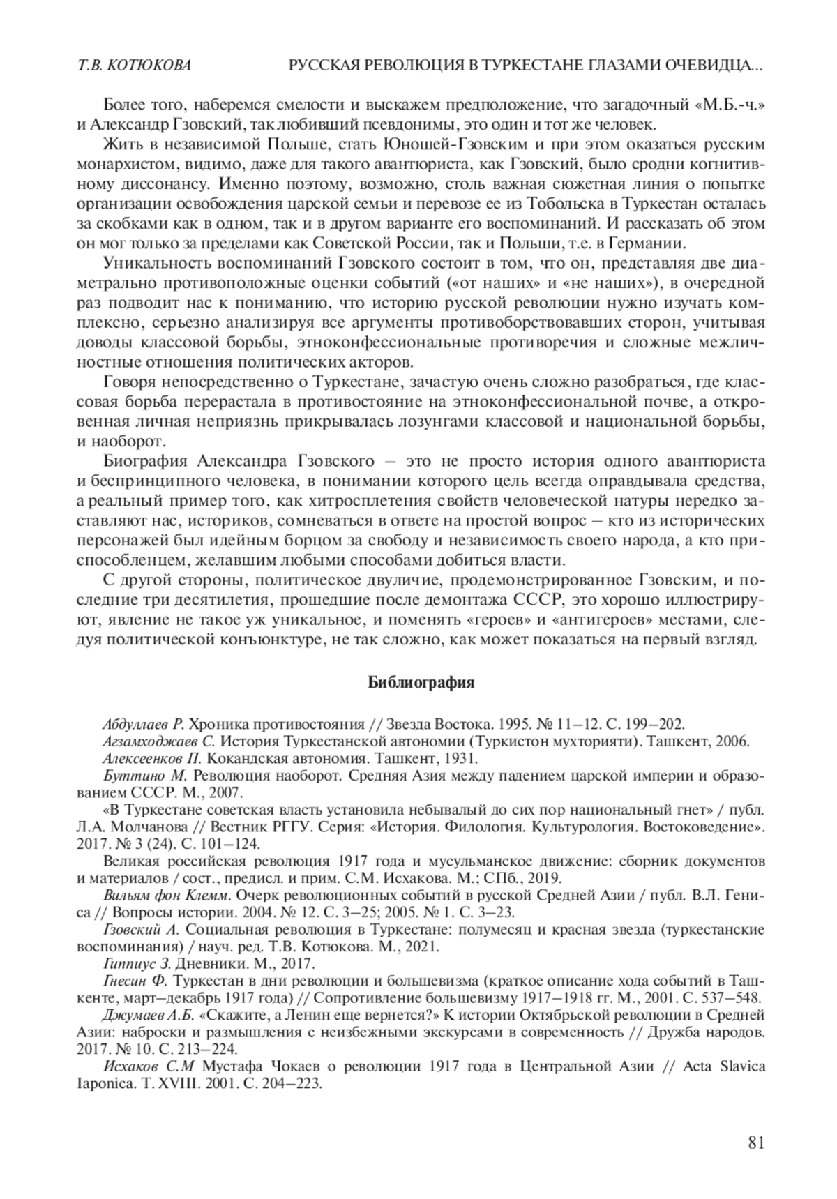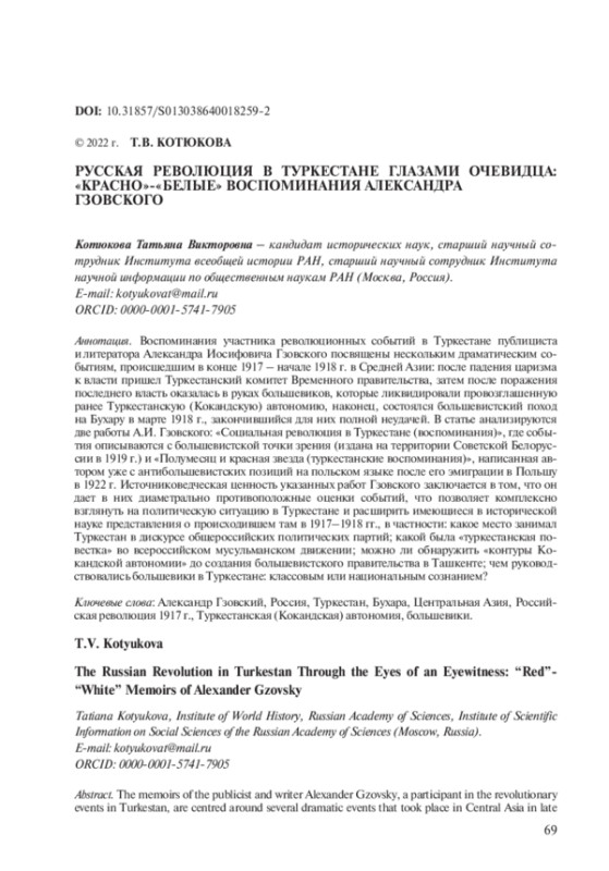 КОТЮКОВА Т. В. РУССКАЯ РЕВОЛЮЦИЯ В ТУРКЕСТАНЕ ГЛАЗАМИ ОЧЕВИДЦА: "КРАСНО"-"БЕЛЫЕ" ВОСПОМИНАНИЯ АЛЕКСАНДРА ГЗОВСКОГО // НОВАЯ И НОВЕЙШАЯ ИСТОРИЯ. 2022. № 1