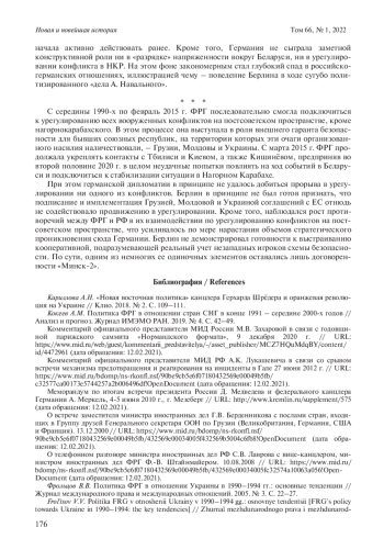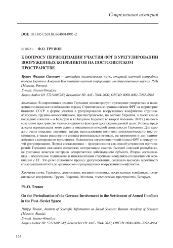 В современных реалиях Германия демонстрирует стремление утвердиться в положении полновесного глобального игрока. Стратегическое проникновение ФРГ на территорию бывшего СССР в форме участия в урегулировании вооруженных конфликтов (грузиноабхазского, грузино-югоосетинского, приднестровского, на востоке Украины, а также самые последние события – в Беларуси и в Нагорном Карабахе во второй половине 2020 г.) на постсоветском пространстве является одним из факторов достижения данной цели. В статье предложена периодизация этого аспекта внешнеполитической деятельности Германии. Для каждого этапа показана эволюция тактик использования политико-дипломатического инструментария, а также расширение состава региональных игроков, на территории и для взаимодействия с которыми он применялся. Выявляется двукомпонентный подход ФРГ к поиску путей урегулирования. Первая составляющая – федерализация как способ устранения противоречий: Германия оказывала поддержку центральным властям бывшей союзной республики, не учитывая зачастую интересы сепаратистски действующего субъекта. Вторая составляющая – обеспечение подписания и имплементации сторонами конфликта соглашения об ассоциации с ЕС. Это резко усложняло процесс урегулирования, создавало высокую вероятность его деградации вплоть до «разморозки» прекращенных вооруженных конфликтов.