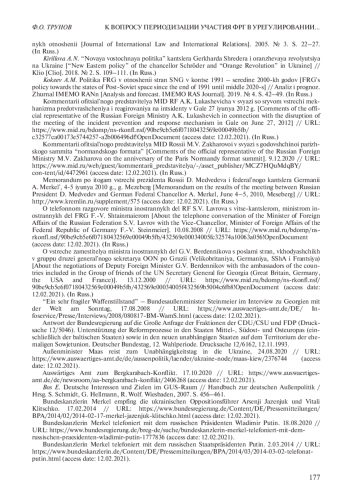 14. Memorandum po itogam vstrechi prezidenta Rossii D. Medvedeva i federal’nogo kantslera Germanii A. Merkel’, 4-5 iyunya 2010 g., g. Mezeberg [Memorandum on the results of the meeting between Russian President D. Medvedev and German Federal Chancellor A. Merkel, June 4-5, 2010, Meseberg] // URL: http://www.kremlin.ru/supplement/575 (access date: 12.02.2021). (In Russ.).